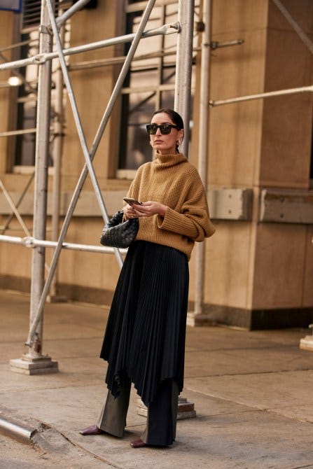 This floaty maxi feels unexpected when paired with a cozy sweater — and if you really want to go bold (or stay warm), copy this fashionista and layer pants underneath.