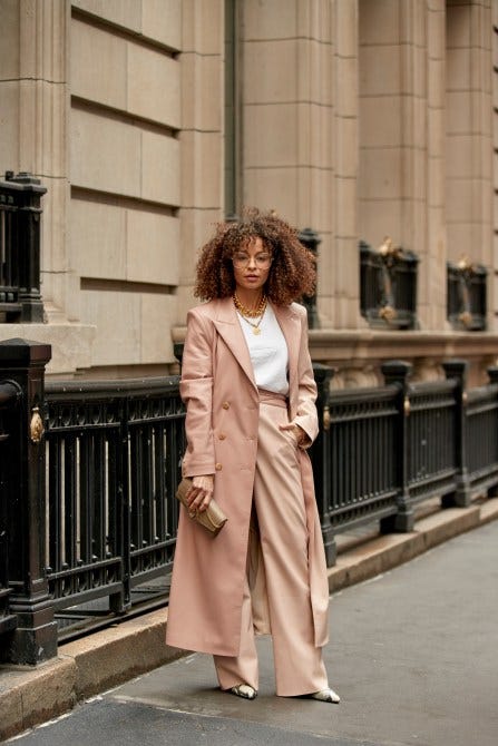 Pastels can work year-round when styled properly. A tailored look in dusty pink is just as classic as black or tan.