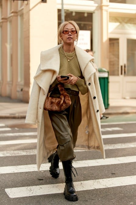 How to dress up a simple sweater-and-trousers look? Style it up with chunky lug sole boots for edge, then add some contrast with a creamy, cozy coat.