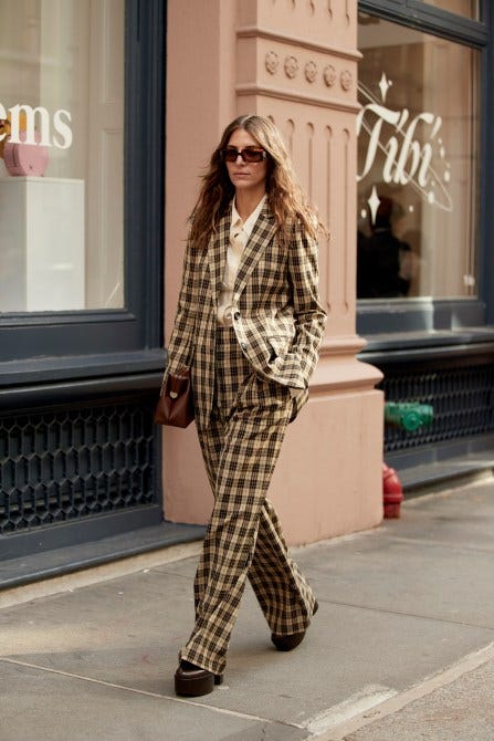 Prints can still be minimalist! This simple suit is jazzed up by the all-over plaid, but the lines are clean and the overall look stays elevated and polished.