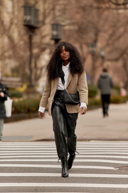 How to make your work blazer street-style ready? Pair it with baggy leather pants for an instantly edged-up look.