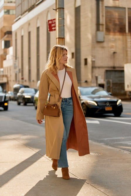 Wearing jeans and a plain white tee? It’s all about the layering. Solidify your perfect neutral coat and complement it with coordinating boots and a handbag.